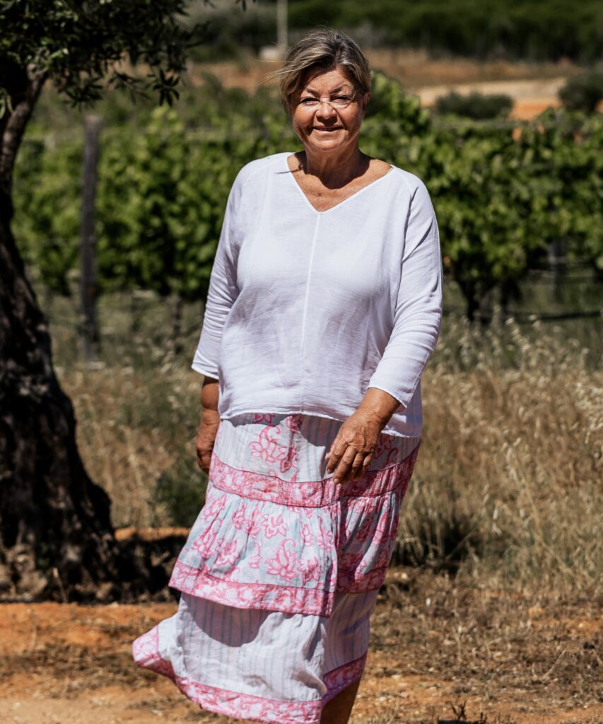 Une femme, un domaine, une vision Monte do Além est avant tout l’histoire d’une femme. Belge d’origine, Vinciane découvre le Portugal au début des années 1990 et tombe immédiatement sous le charme de cette lumière, de cette douceur atlantique et de cette terre encore préservée. En 1995, elle choisit de s’installer durablement dans le sud du pays, à Odiáxere, au cœur de l’Algarve. Très vite, une évidence s’impose à elle. Non pas produire du vin pour produire du vin. Mais créer, dans une région où la viticulture de qualité restait largement à inventer, un véritable domaine d’auteur, fondé sur le respect du sol, la recherche de maturité parfaite du raisin et une vision patiente du temps. En 2002, elle plante ses premières vignes. À cette époque, le pari est audacieux. L’Algarve est connue pour ses agrumes, son tourisme, son soleil… rarement pour ses vins de garde. Vinciane décide pourtant d’y appliquer une philosophie inspirée des grands domaines européens : travail parcellaire, rendements volontairement limités, vinifications précises, élevages longs, et surtout une exigence absolue sur la qualité du raisin. Dès l’origine, elle fait un choix fondateur : l’agriculture biologique. Non comme argument commercial, mais comme condition indispensable à l’expression sincère du terroir. Aucun produit de synthèse n’entre dans les vignes. Chaque intervention est pensée comme un accompagnement du vivant, et non comme une correction technique. Depuis plus de vingt ans, Vinciane est présente à chaque étape clé : la taille hivernale, le suivi des parcelles, la surveillance sanitaire, le contrôle des maturités, les dégustations quotidiennes des baies avant vendange, les décisions d’assemblage. À Monte do Além, le vin n’est jamais la simple conséquence d’un protocole. Il est le fruit d’un regard, d’une sensibilité et d’une lecture fine de la nature. Aujourd’hui encore, partageant son temps entre Bruxelles et le domaine, Vinciane reste l’âme vivante de Monte do Além. Une vigneronne indépendante, discrète et profondément engagée, qui a choisi de bâtir, loin des appellations prestigieuses, un lieu de vérité et d’exigence.